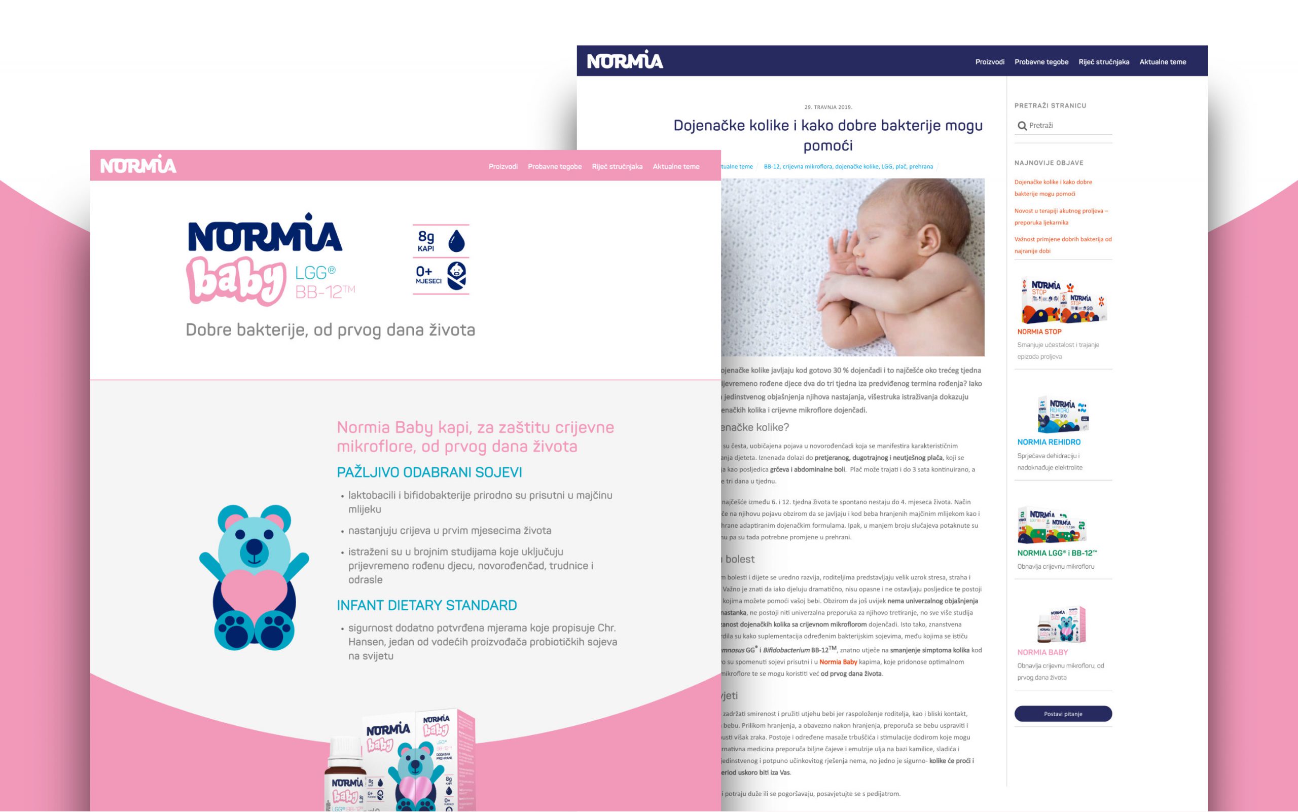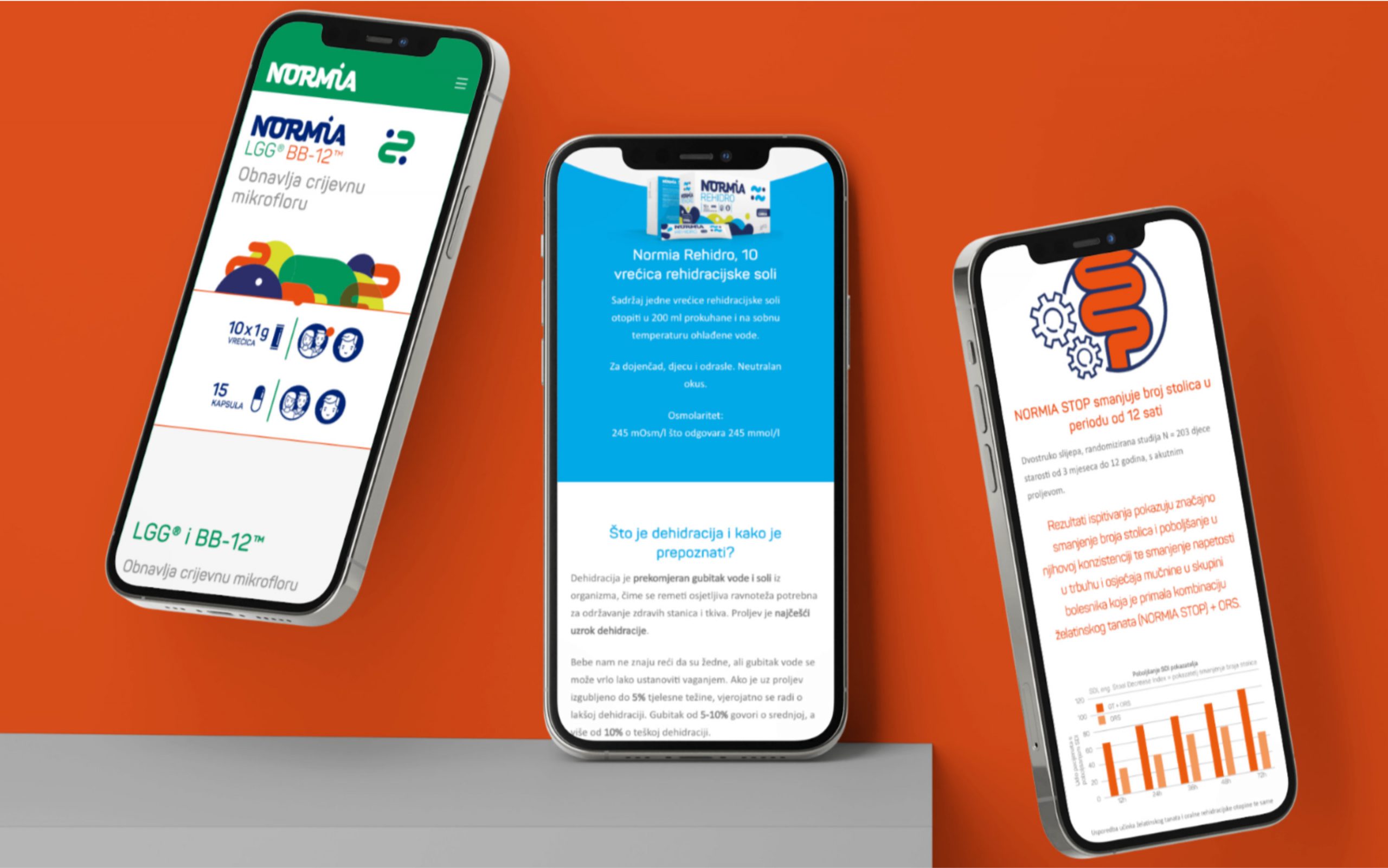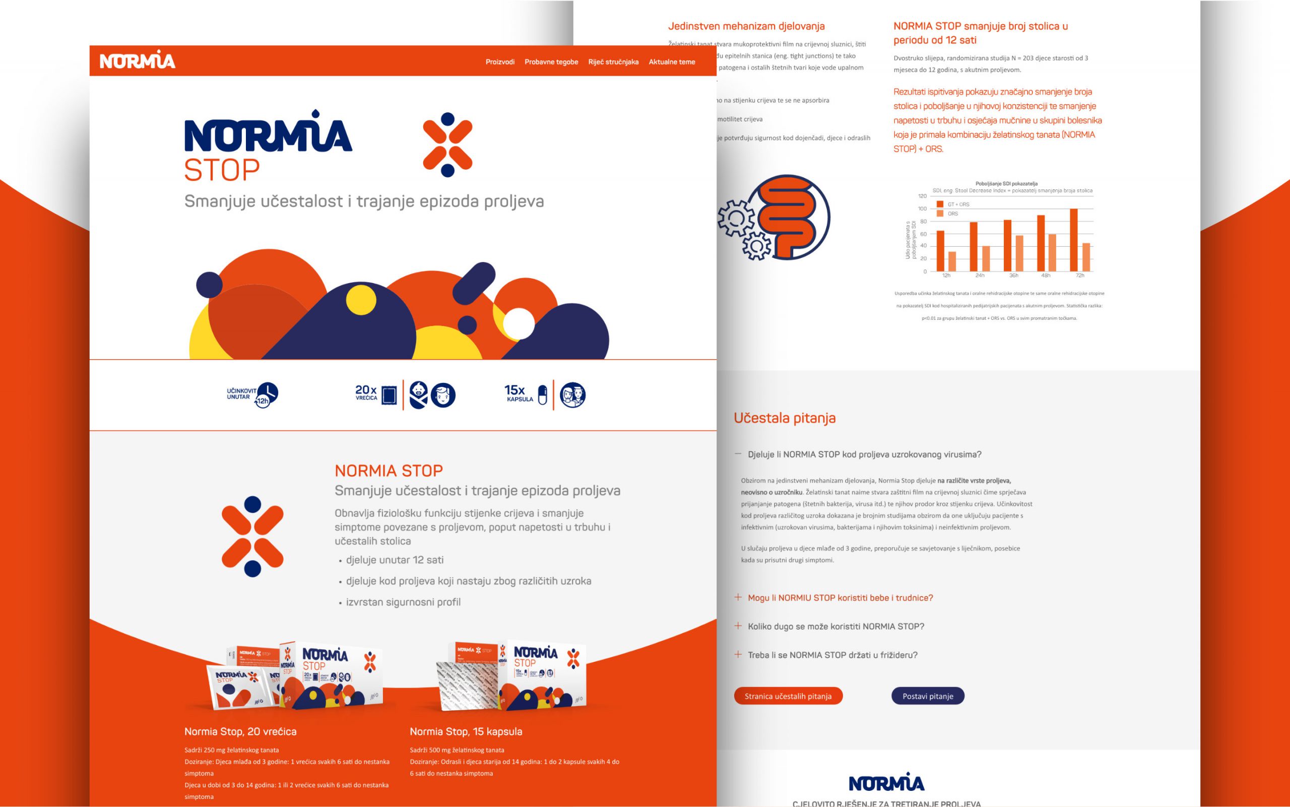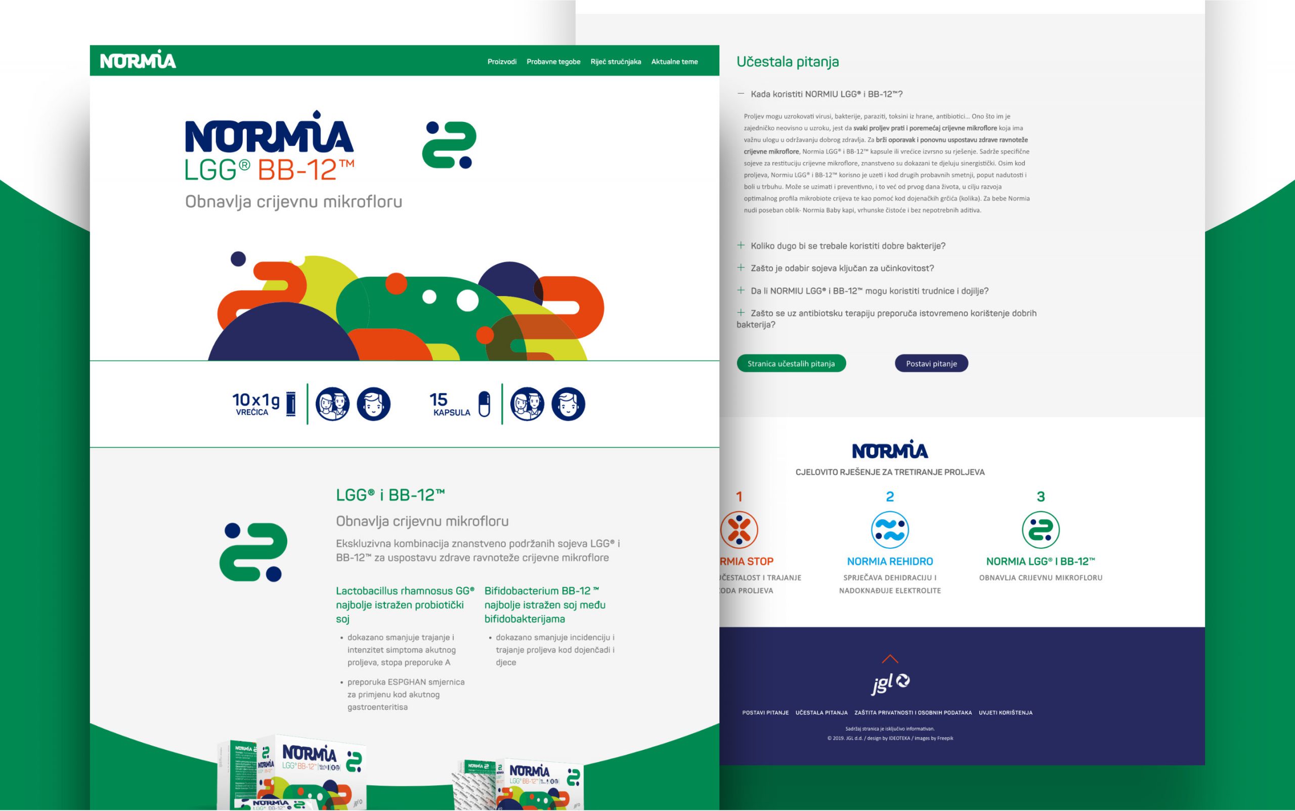 The client Jadran – Galenski laboratorij (JGL), one of the biggest regional pharmaceutical companies, required a new website for their rebranded line of Normia, a complete solution for treating diarrhea. Firstly the new website had to follow the new brand guides. Secondarily, the webpage had to be structured in such a way that every product in a line has its own separate page that will be used in the further campaign as a landing page for online advertising.